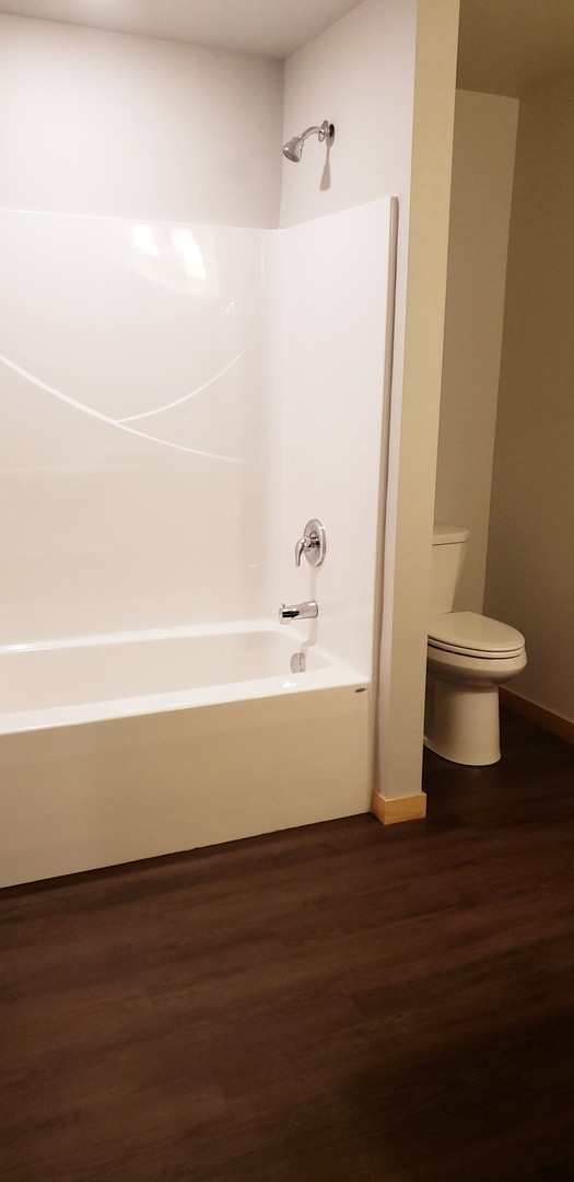This thoughtfully designed home features 2 bedrooms and a spacious bathroom with a bathtub and ADA support bars for both the tub and toilet (not shown in photos). The open living and dining areas offer a welcoming space to relax, with durable wood laminate flooring throughout.
