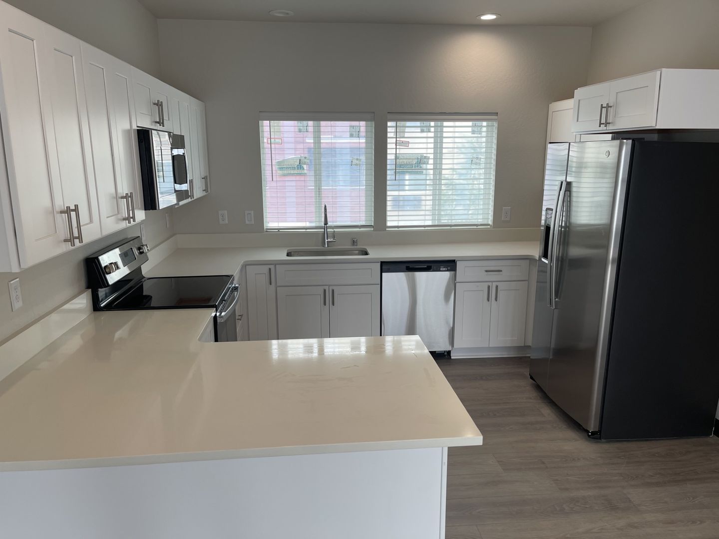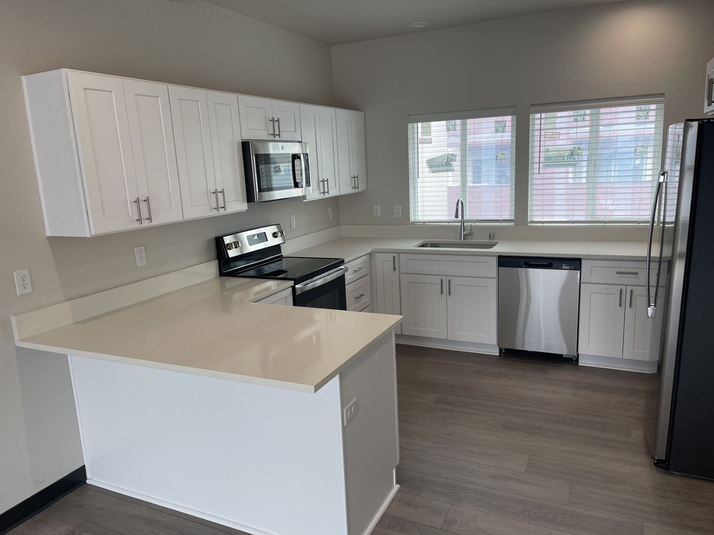 Modern Kitchen: Open-concept design with stainless steel appliances (fridge, dishwasher, stove/oven, microwave), sleek quartz countertops, and ample cabinet storage