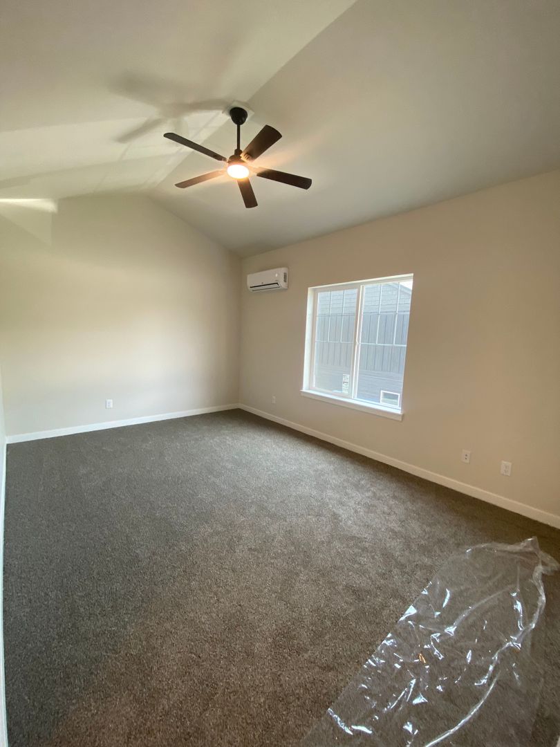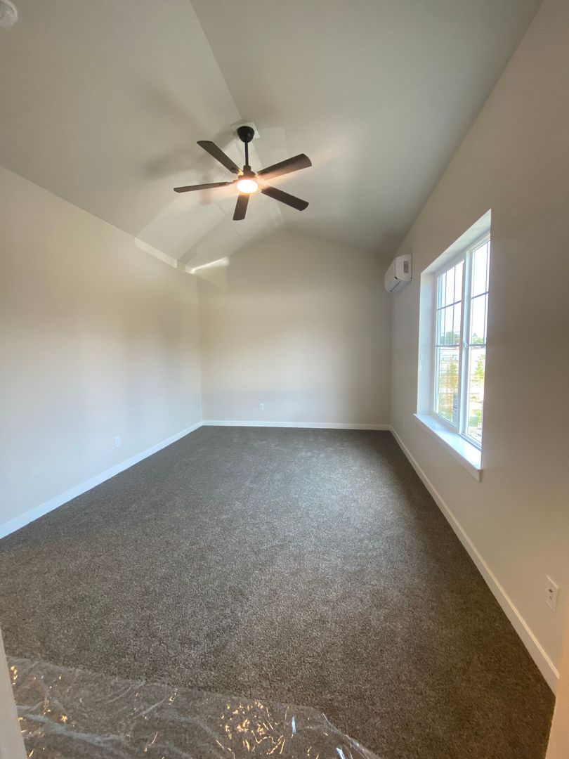 Spacious primary suite with cathedral ceiling, ceiling fan, and private bathroom